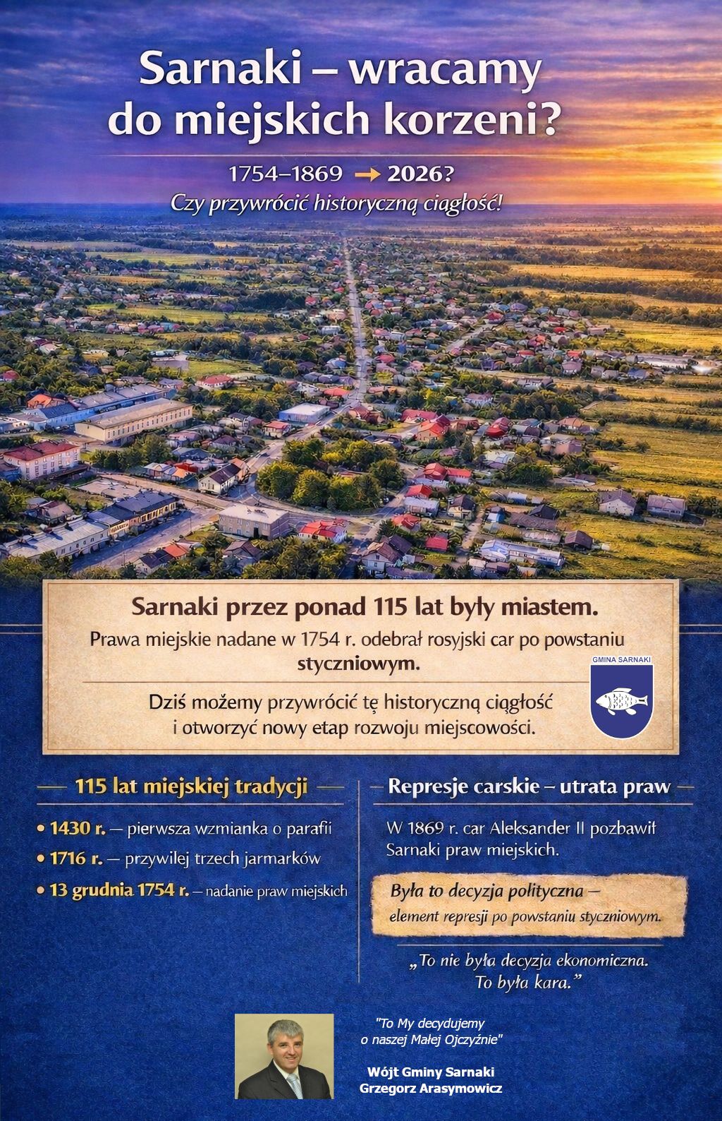 Wójt Gminy Sarnaki informuje, że Zarządzeniem nr OR.0050.12.2026 z dnia 13 lutego 2026 r. zainicjował przeprowadzenie konsultacji społecznych z mieszkańcami Gminy Sarnaki w sprawie nadania statusu miasta miejscowości Sarnaki.